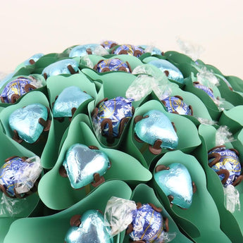 This large aqua chocolate flower arrangement contains a mix of solid milk and Lindt chocolates. Versatile for all occasions from anniversaries, to simply letting someone know you care.