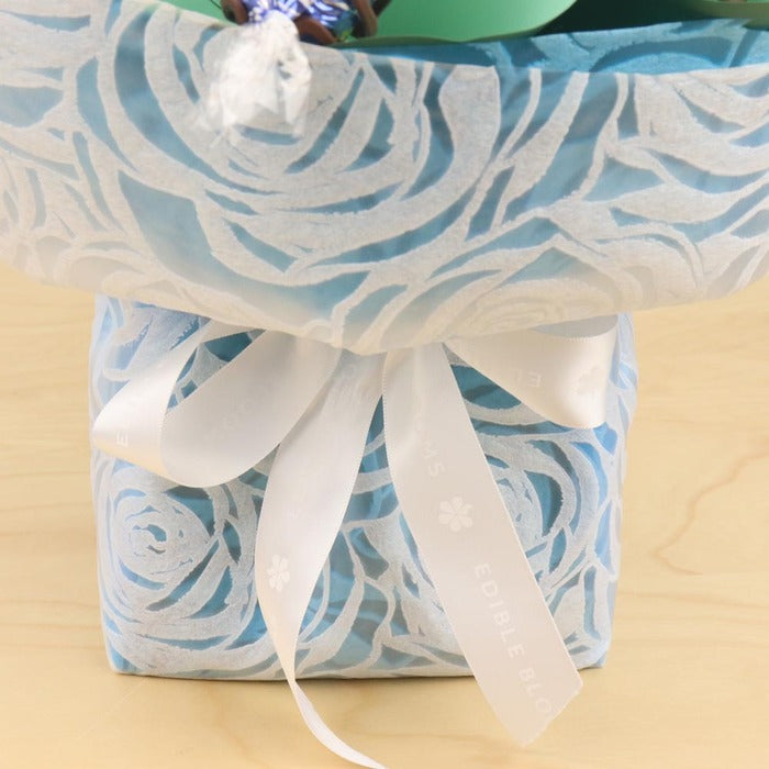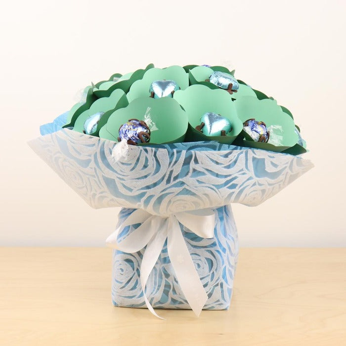 This pretty aqua posy contains a mix of solid milk chocolates and Lindt chocolates. Versatile for all occasions from thank you gifts to baby showers.