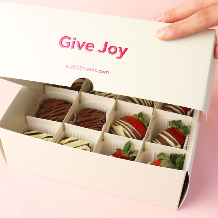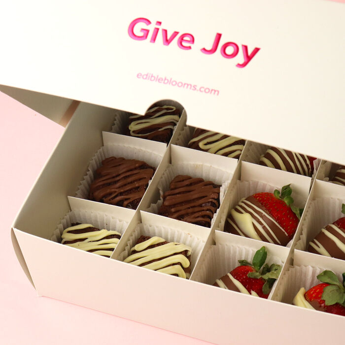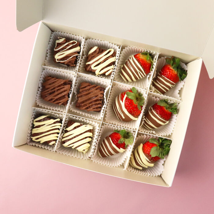 Our bestselling chocolate-covered strawberry is now paired with indulgent brownie bites packed in a treat gift box, the perfect combination of fresh chocolate-dipped strawberries and chocolate brownie packaged beautifully in our gold-foil gift boxes.