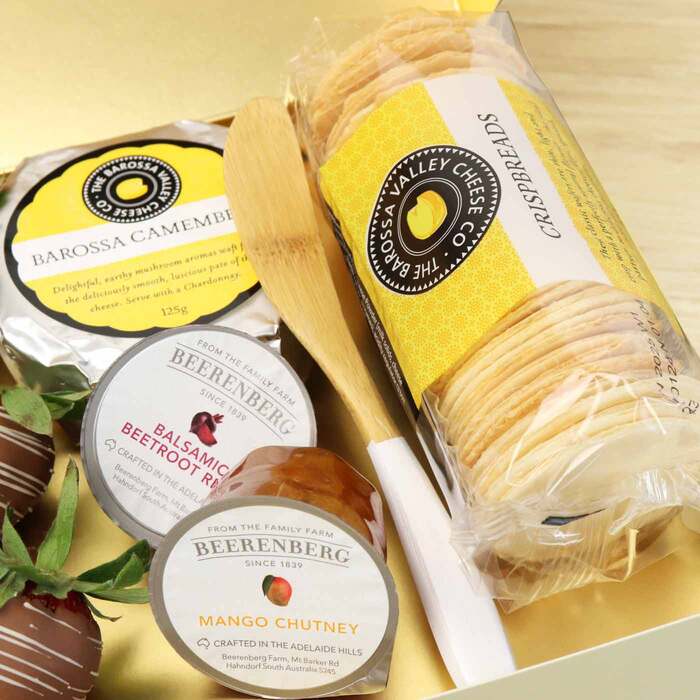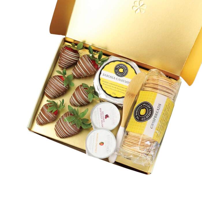 Our bestselling Belgian milk chocolate dipped strawberry gift box has found its match, with delicious Barossa Cheese and crackers to enjoy making this the perfect fresh treat to share with someone you love.