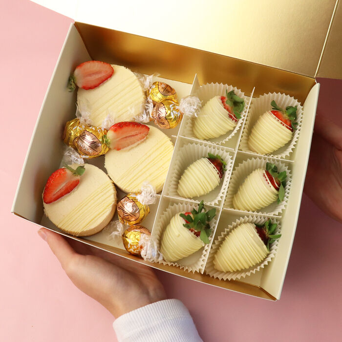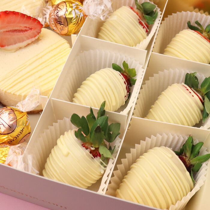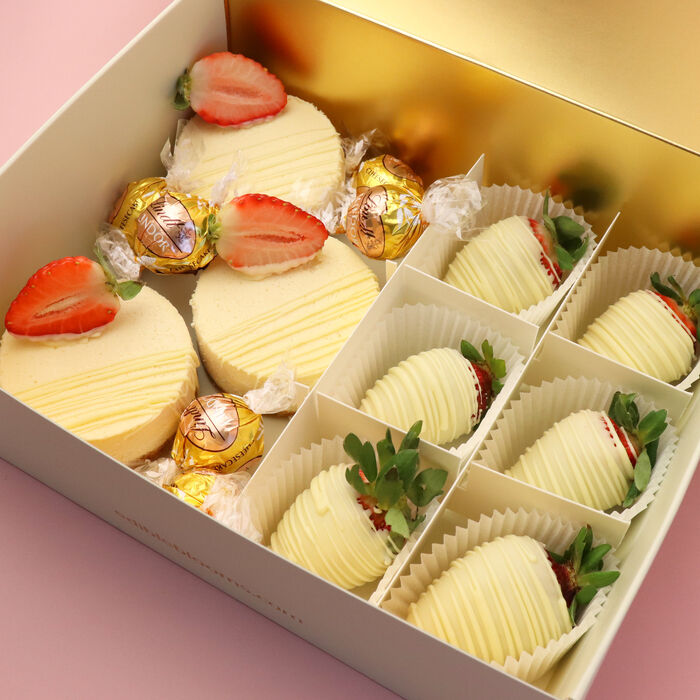 A decadent dessert box filled with creamy mini Cheesecake's and fresh strawberries coated in Belgian white chocolate. Suitable for Mother's Day, Housewarming or simply a sweet afternoon treat.