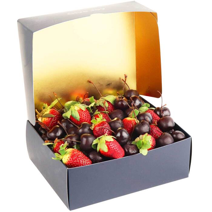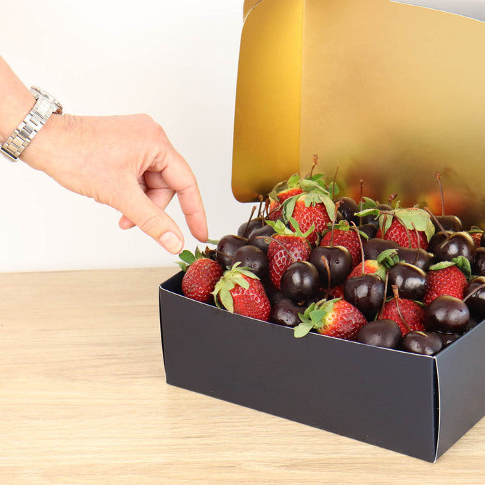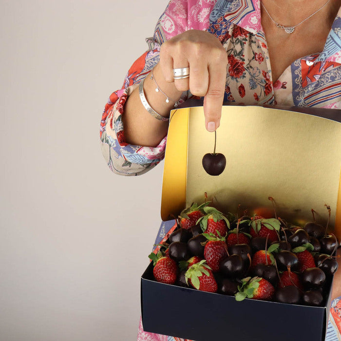 This year, celebrate Christmas with sweet, delicious cherries and strawberries. Proudly provided by local South Australian growers, direct to Edible Blooms. Delivered in a stunning navy gift box, with a gold foil interior combined with Lindt chocolates.