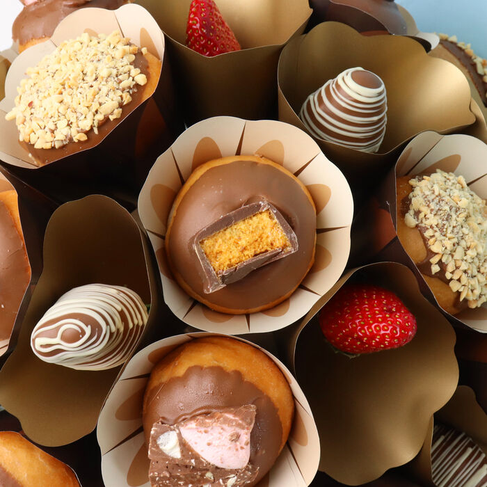 Donut send a boring gift, send an exciting gift like a Donut Bouquet! Delicious Donuts coated in creamy Belgian chocolate topped with all your favorites, nuts, rocky road, strawberry and of course more CHOCOLATE!