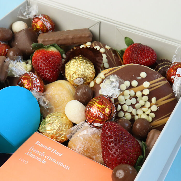 Spoil your loved one with our Donut Dessert Box with Nuts. A deliciously decadent combination of chocolate donuts, honeycomb, and savoury nuts. The perfect gift for someone who would love a treat to eat now and savour for later.