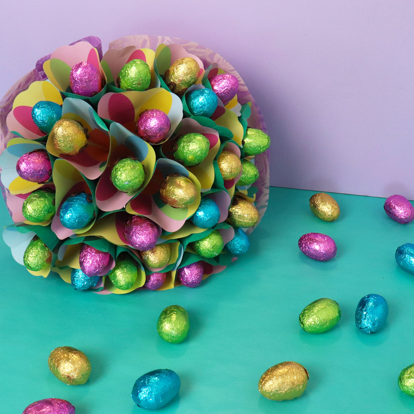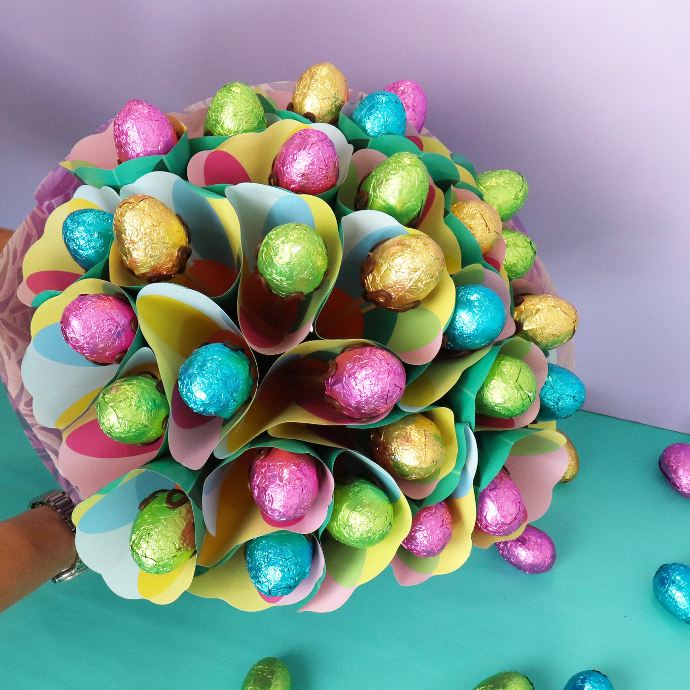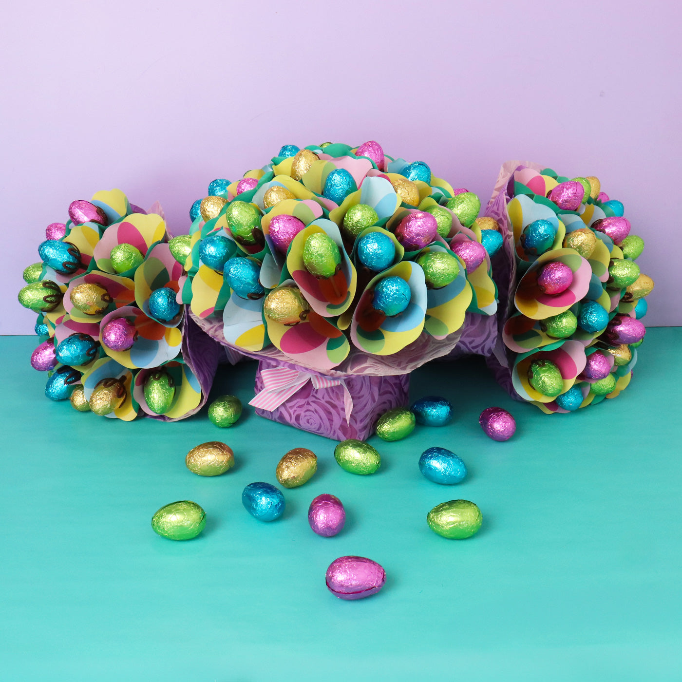 Easter Egg Gift brimming with 28 Delicious milk chocolate eggs in a stunning pastel-coloured bouquet. Put a twist on traditional Easter gifting, this bouquet makes a great gift for adults and kids.