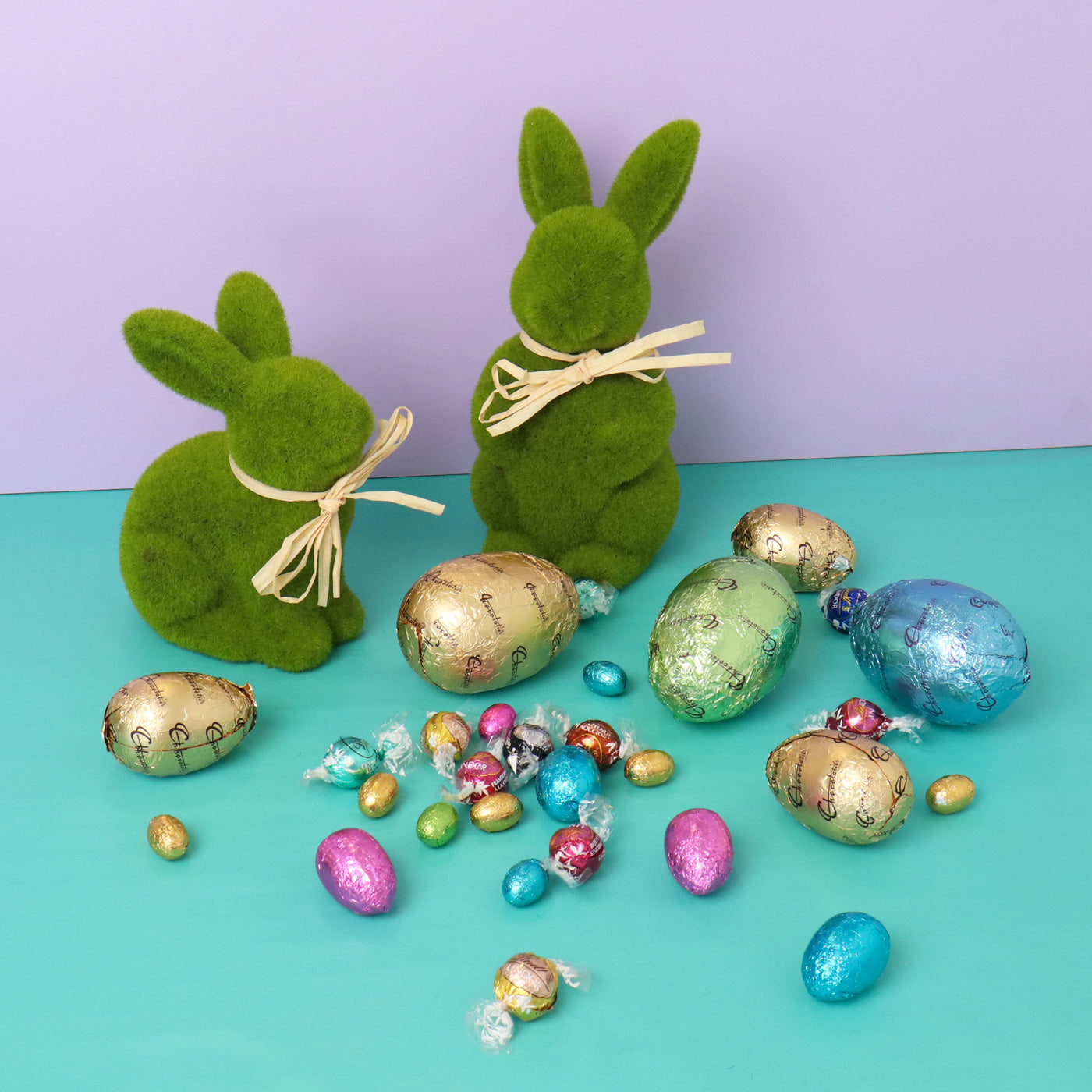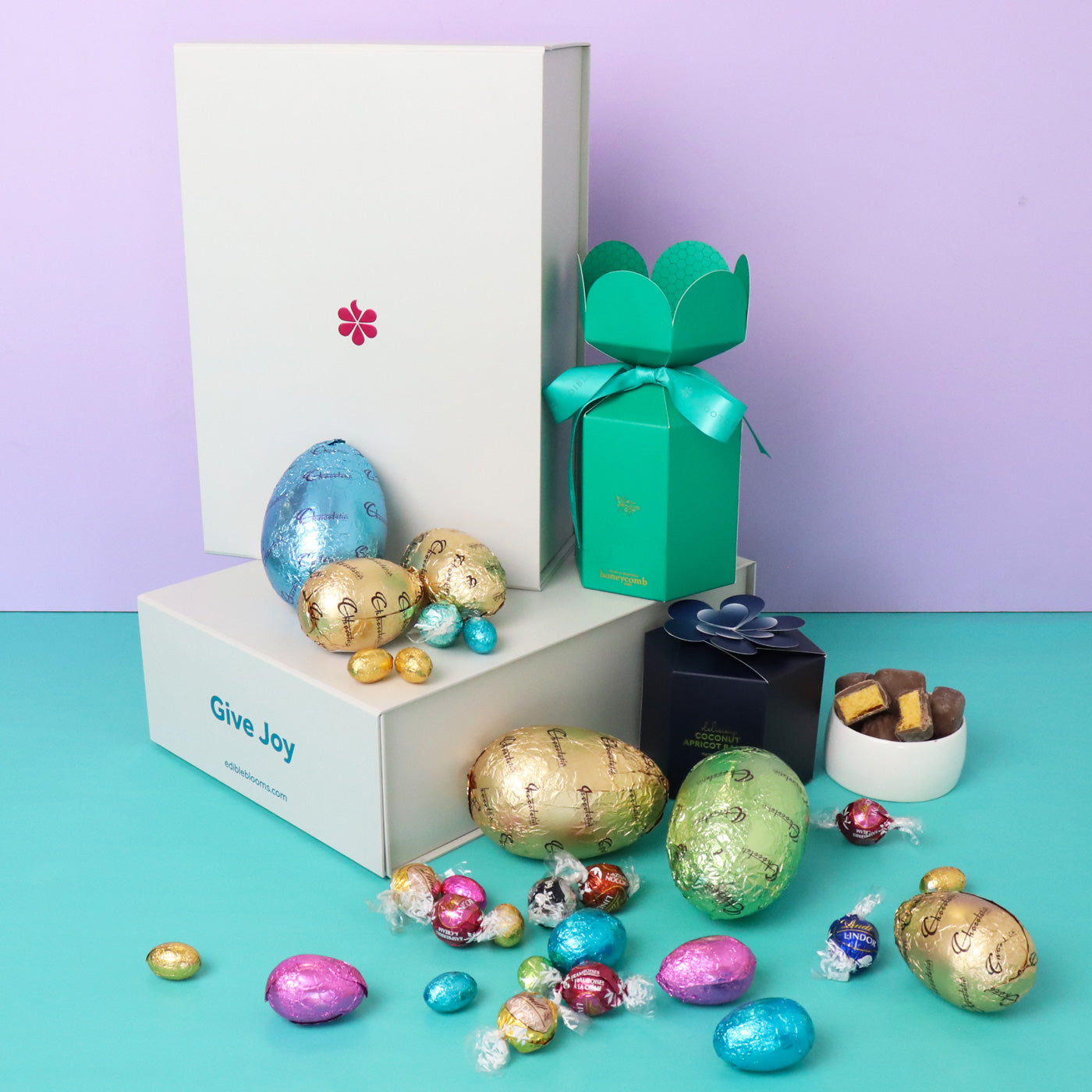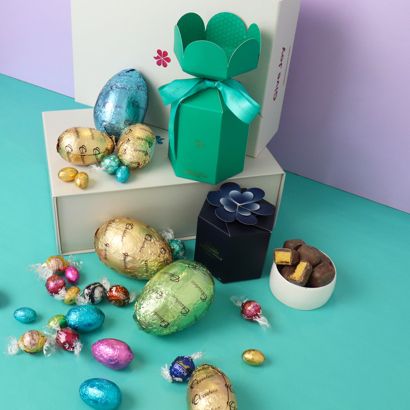 The perfect Easter gift hamper. This stunning hamper is filled with only the most creamy of milk chocolate eggs, a delicious combination of Lindt and Chocolatier, along with locally sourced gourmet chocolate treats.