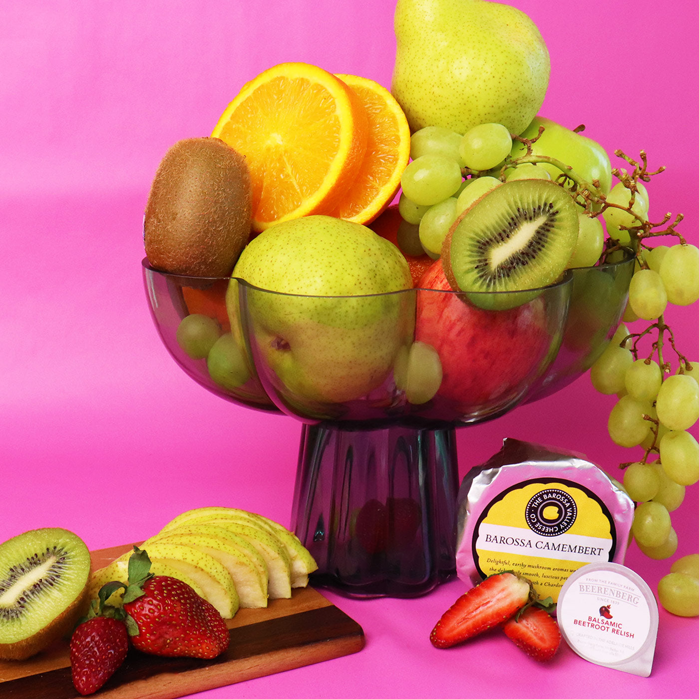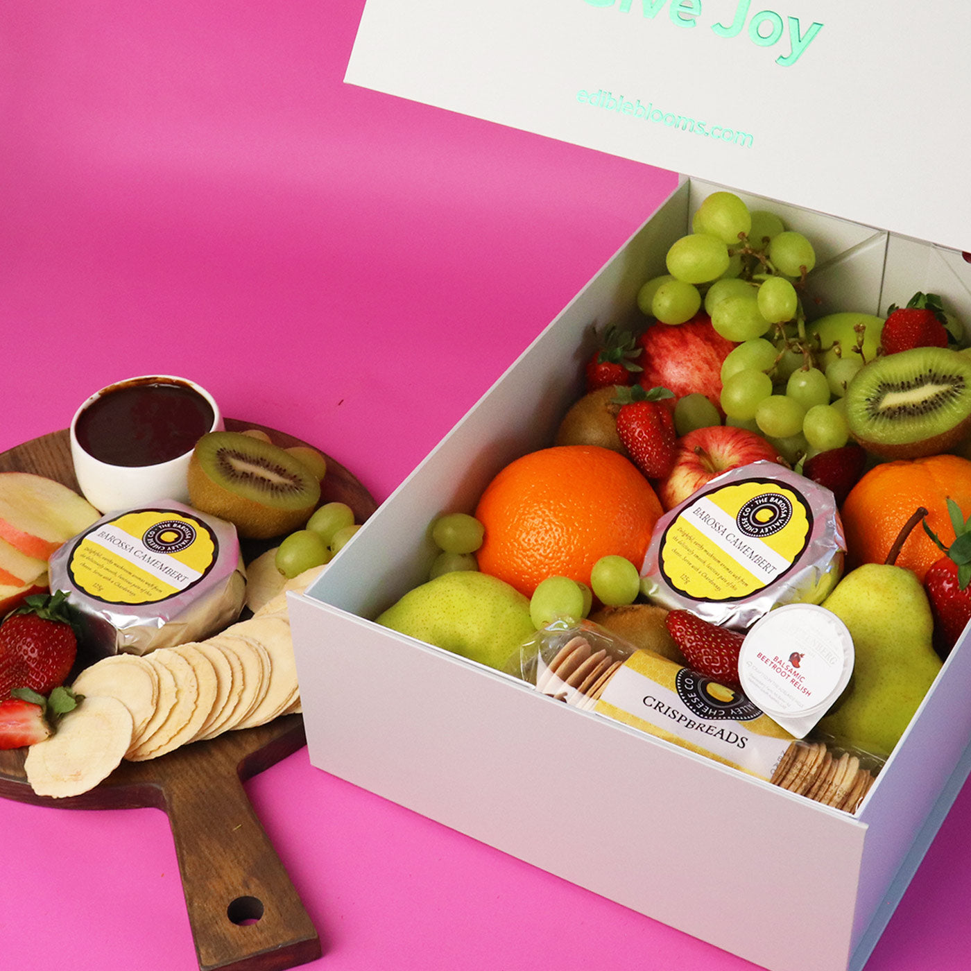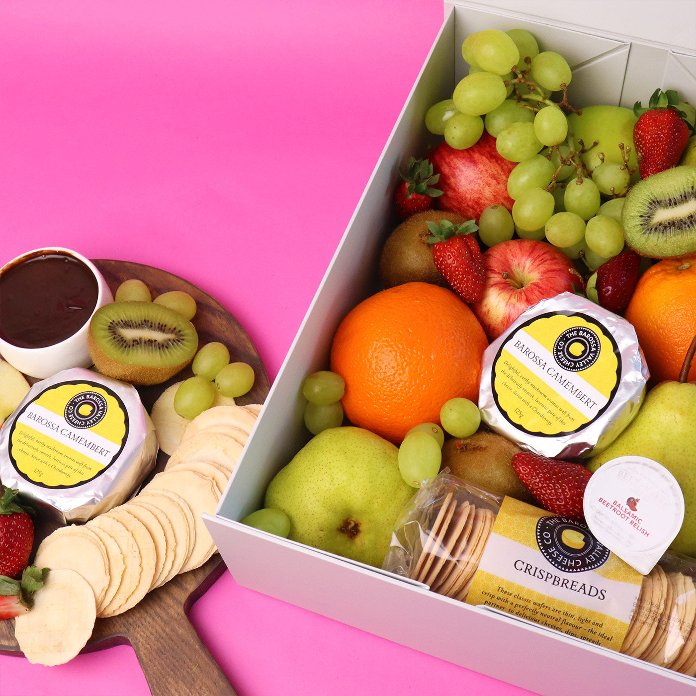 Enjoy our fruit hamper containing a stunning variety of premium fresh seasonal fruits, Barossa valley cheese & crackers. The perfect combination of sweet, savoury, and healthy to gift to offices, families, and friends. Beautifully presented in our signature gift box.