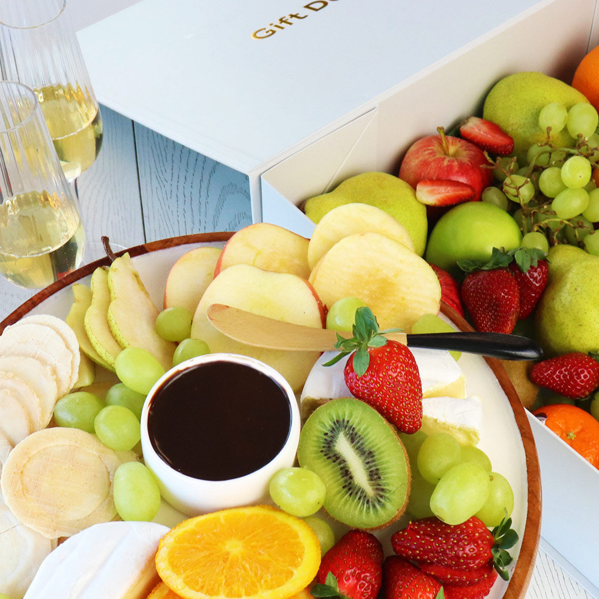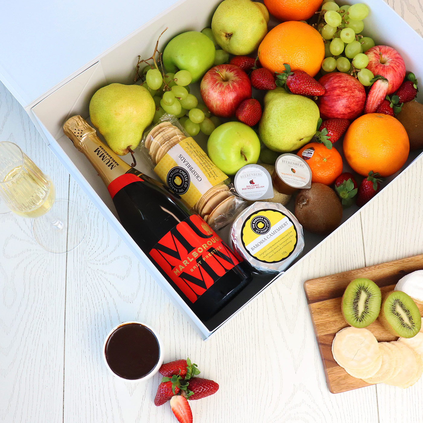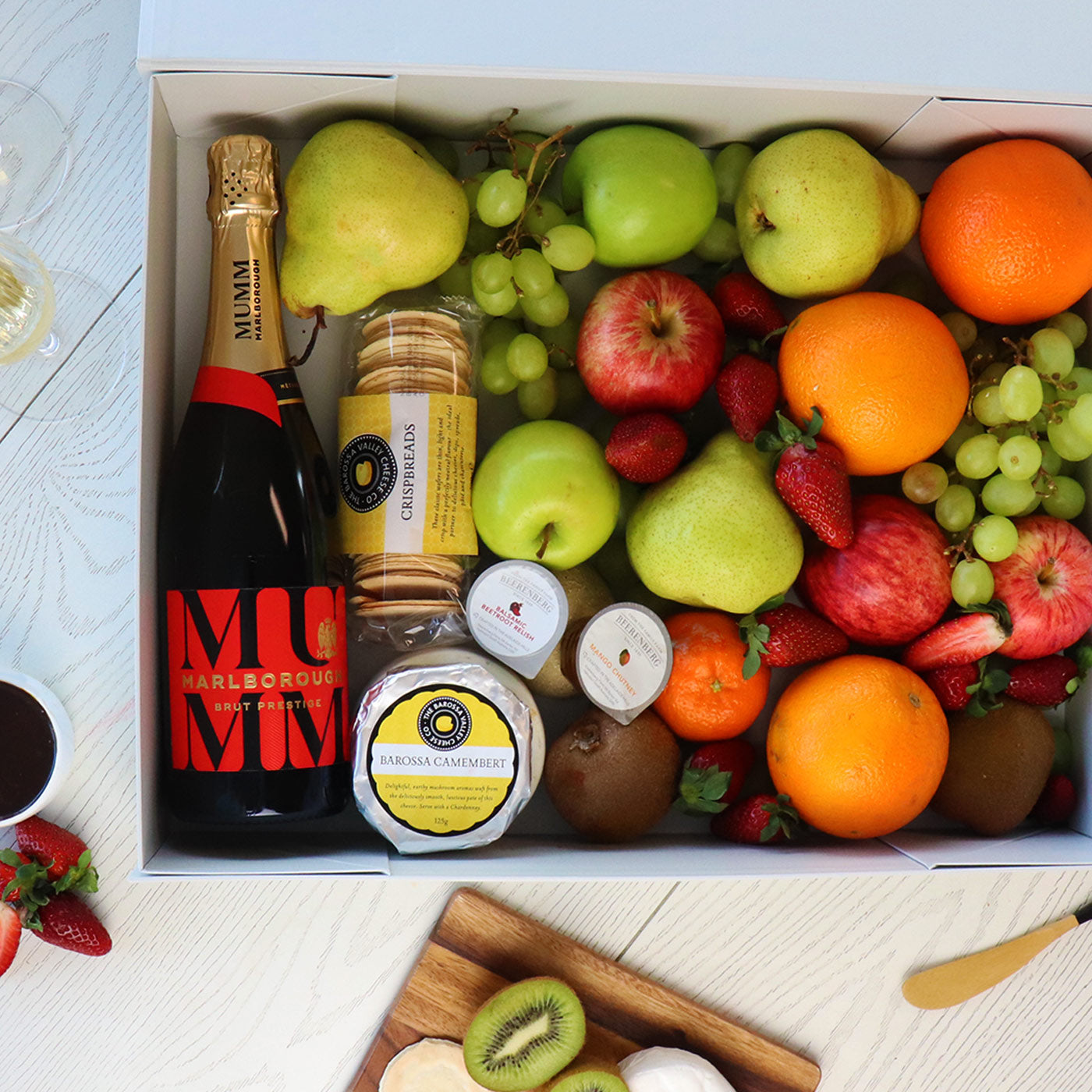 Our large fruit hamper & Sparkling Wine contains a variety of premium fresh seasonal fruits packaged with Barossa Cheese & gourmet nibbles. It's the perfect hamper, complete with a cheese knife, to create a fruit platter. This indulgent fruit box is suitable for any group celebration or family event.