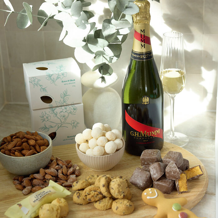 Our 'G.H.Mumm Christmas Hamper ' is filled with all kinds of delicious treats to celebrate Christmas. From luxurious chocolate treats to savoury almonds and mini melting moment biscuits. All topped off with a bottle of G.H.Mumm champagne.