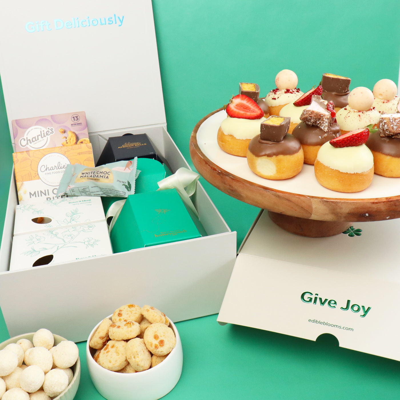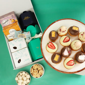 Our best-selling Donuts & Gourmet Hamper are paired together to SAVE! Our donuts are dipped fresh daily and delivered same day to your door, combined with a taste sensation with gourmet sweet & savoury treats to save for later.