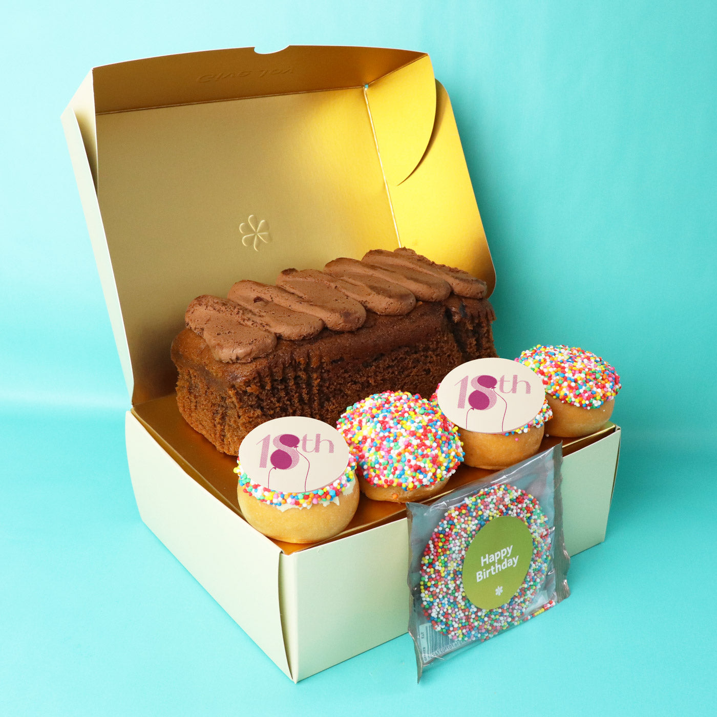 This little treat box, packs and punches, for a special 18th Birthday celebration. 6 delicious gourmet chocolate-dipped donuts, including a milk chocolate edible 18th birthday message and a birthday speckle to top it off! Wish someone a very happy birthday with same-day delivery.