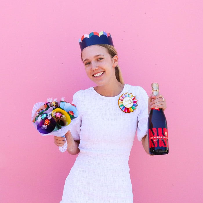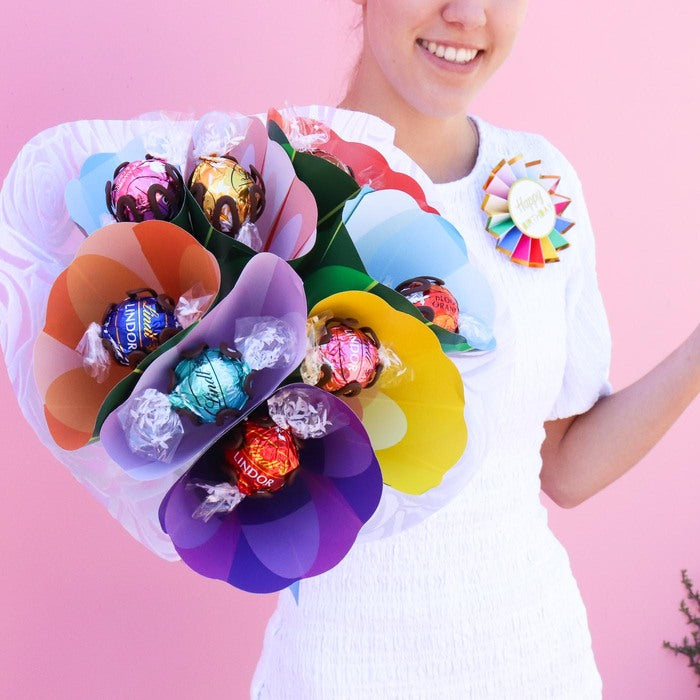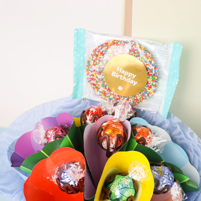 A birthday gift hamper that will have you singing, 'hip hip hooray!' With a vibrant rainbow Lindt rainbow chocolate bouquet and your favourite bottle of bubbles, with a large chocolate speckle.