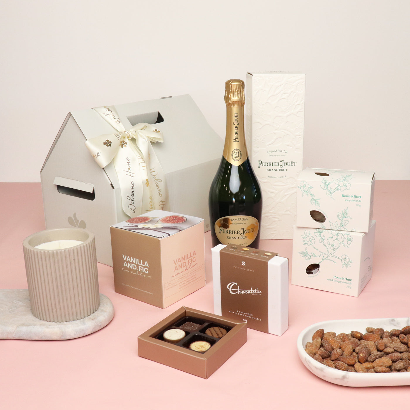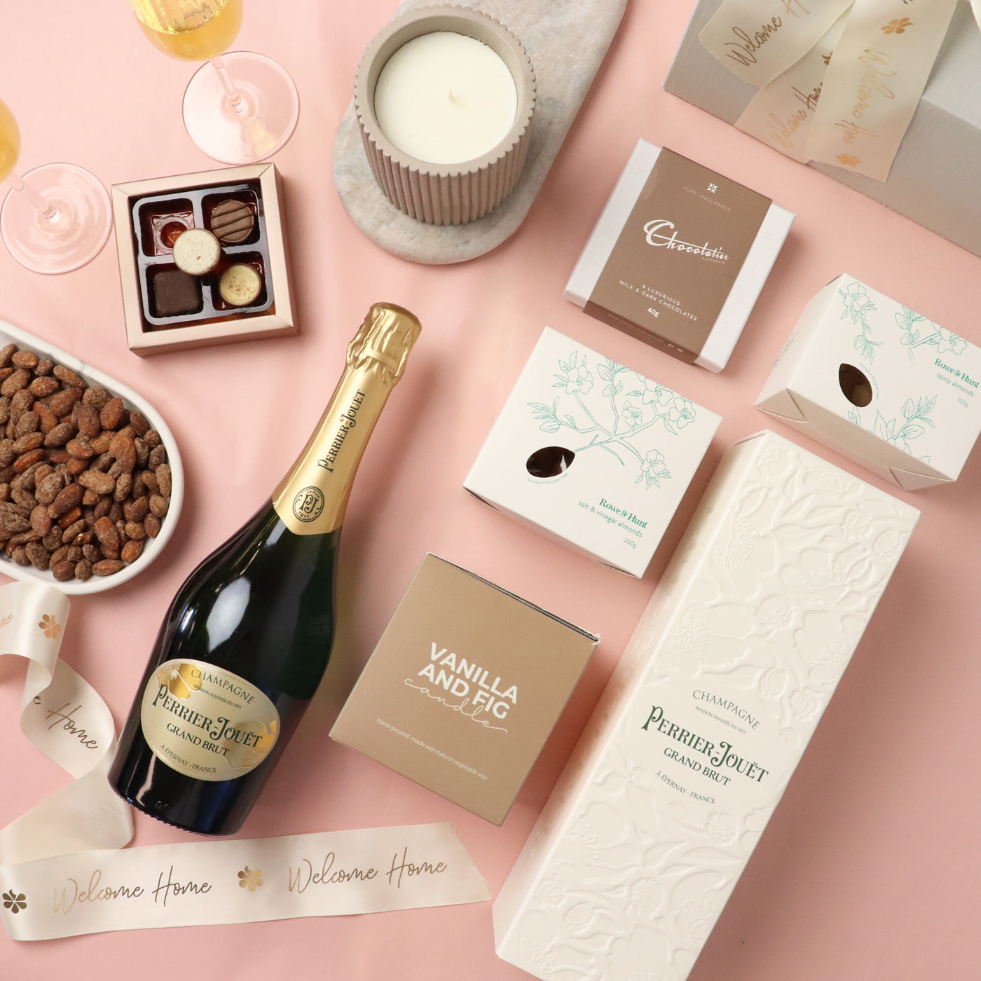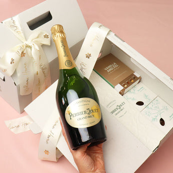 A celebration of a new home with this uniquely designed Home Celebration Hamper. Celebrate with the finest French champagne, Perrier Jouet Grand Brut, chocolate truffles, and say welcome home with our beautiful, wide satin ribbon.