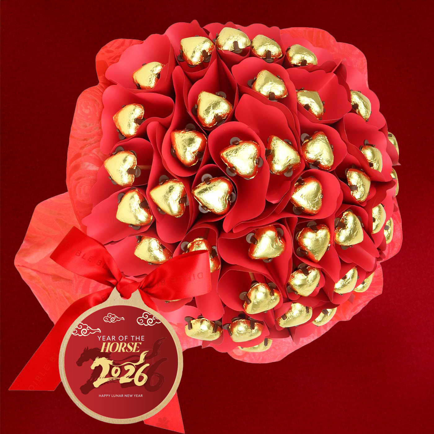 An abundance of 48 stunning gold Belgian milk chocolate hearts to celebrate a Lunar New Year 2025.