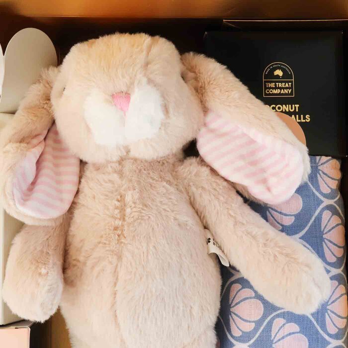 Luxury celebration baby hamper, French Champagne to welcome a new bub to the world, along with a soft toy, swaddle and sweet treats for the whole family.