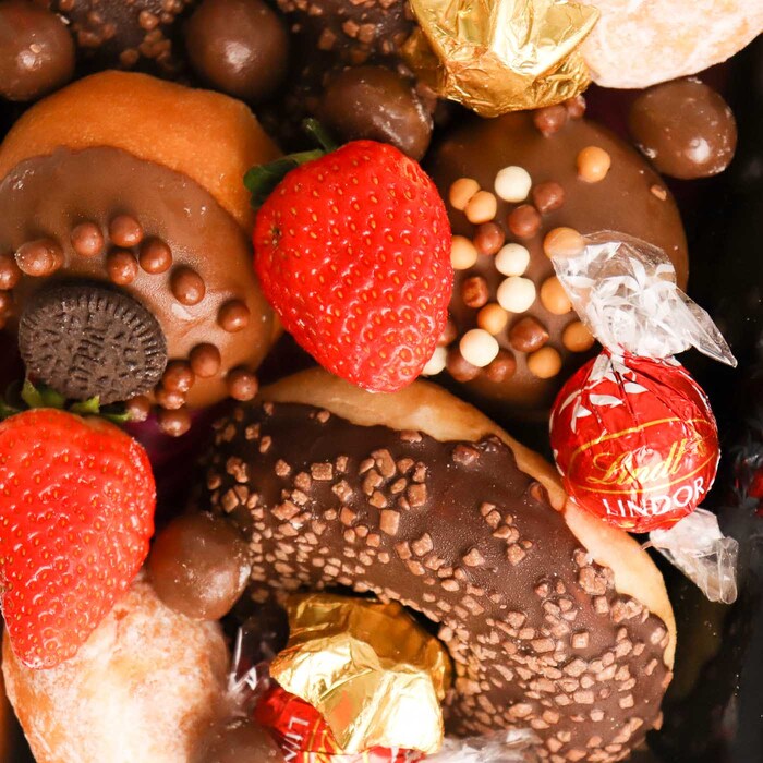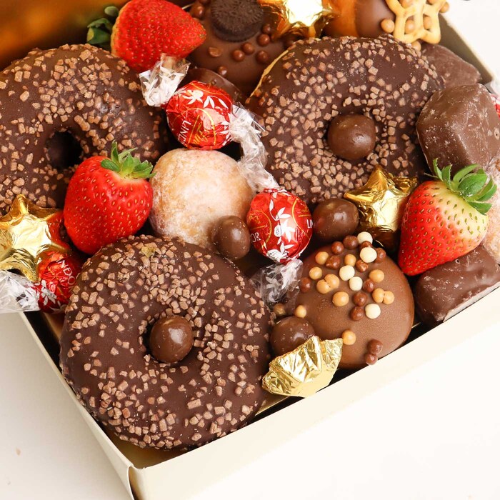 This delicious dessert treat box has been packed to the brim with your all-time favourite milk chocolate goodies. We've got your afternoon sugar hit sorted. From delicious chocolate donuts, to irresistible fresh strawberries and we've even thrown in an assortment of little treats!