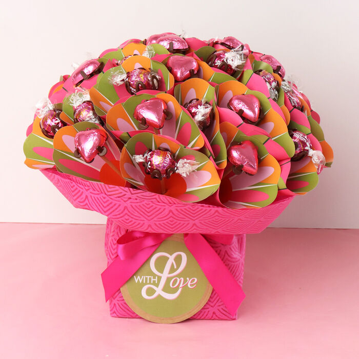 Make any day special with a bouquet filled with milk chocolate hearts and raspberry lindt. The best way to spoil with 40 chocolates in a beautiful bouquet with same-day delivery Australia-wide.