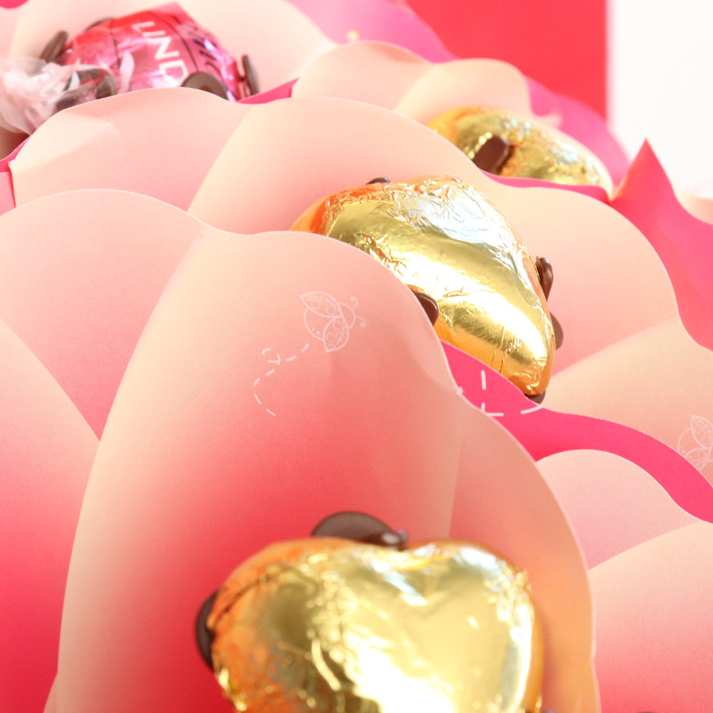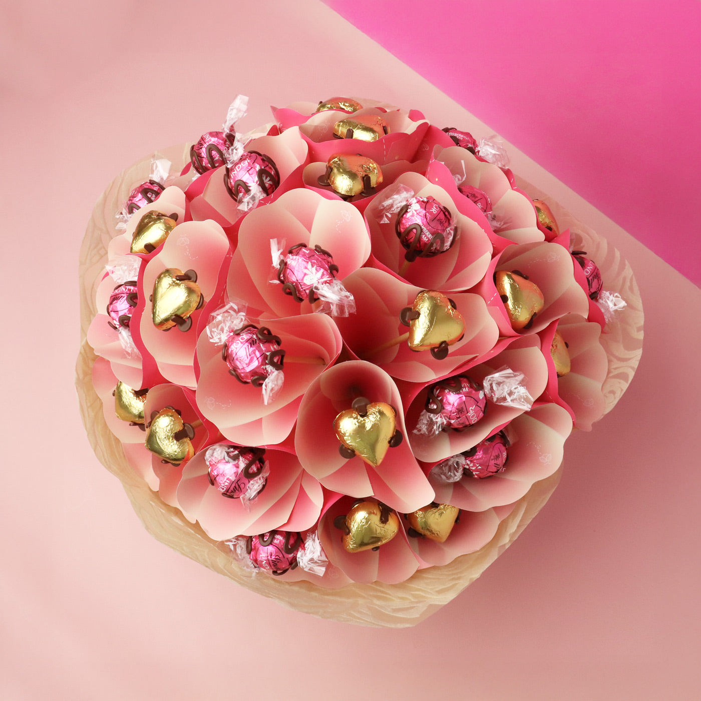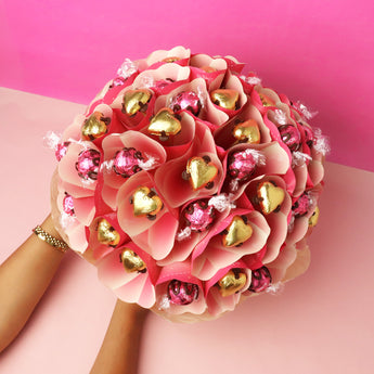 Crafted to deliver love. The perfect pairing of Strawberry and Cream Lindt and creamy milk chocolate hearts. All packaged beautifully wrapped in our new tulip cones and green wrapped placed within a carry bag.
