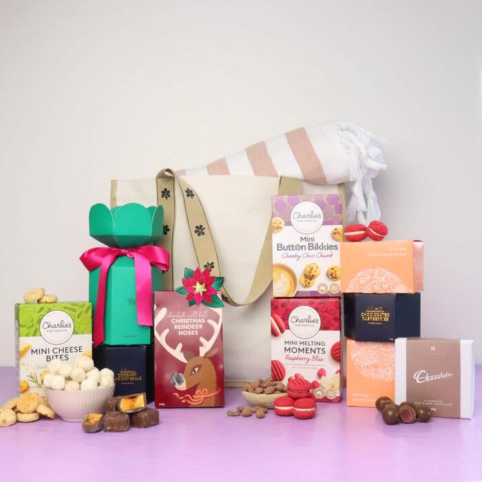 The Summer Tote bag is a carefully crafted canvas bag, the ideal gift for summer-loving friends. Elevate your gifting experience with this unique take on a gift hamper, a stylish canvas tote bag suitable for everyday use filled with a soft Bambury beach towel, filled to the bring with gourmet Christmas sweet & savoury treats.