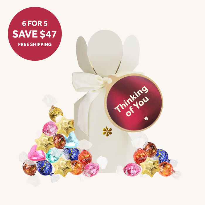 Save $45, and receive 6 gifts for the value of 5 with this sweet bundle deal. A chocolate thinking of you gifts to give to a friend, family member or colleague. Filled with luxuriously creamy and smooth Lindt chocolates and packaged beautifully in a gold-foiled taupe gift box.