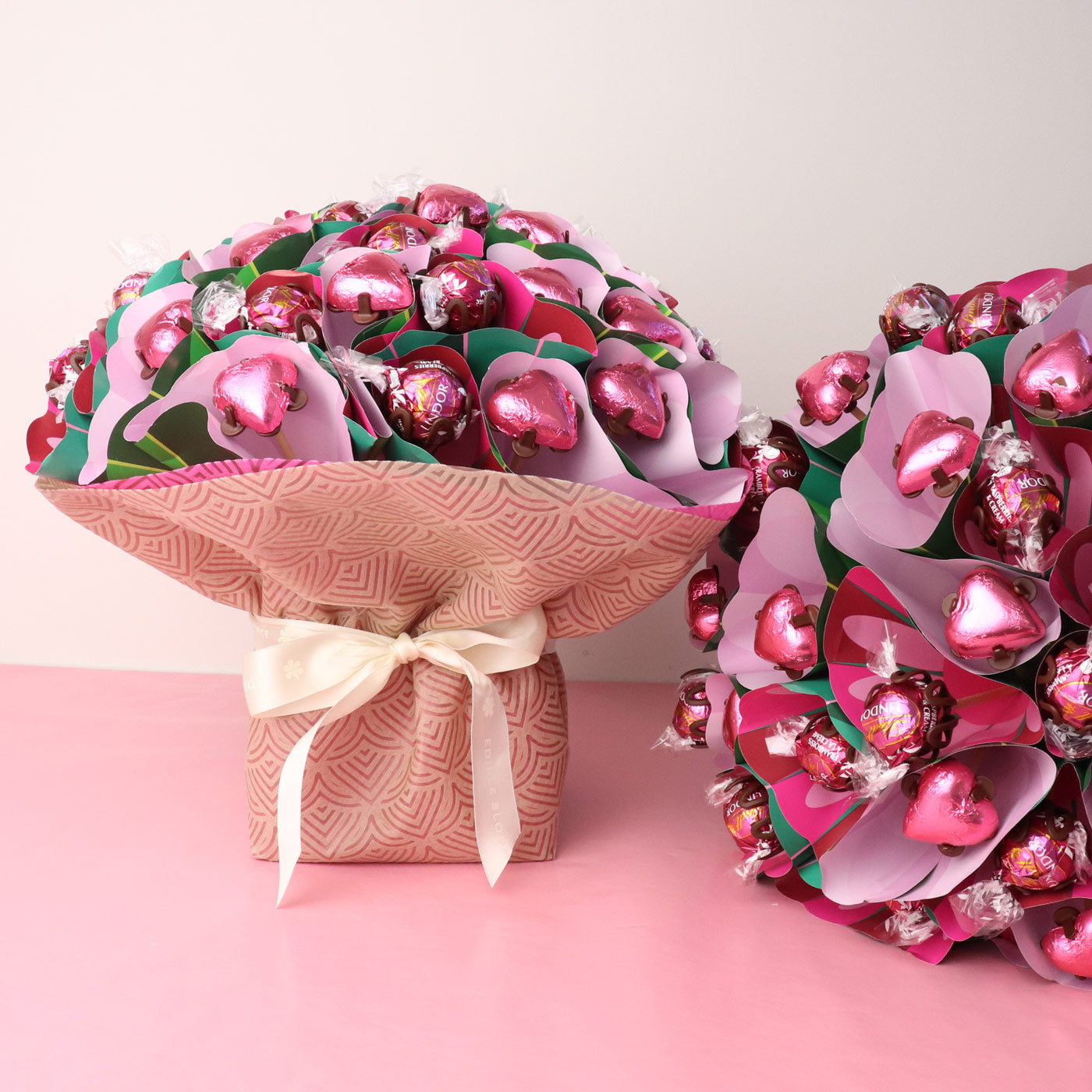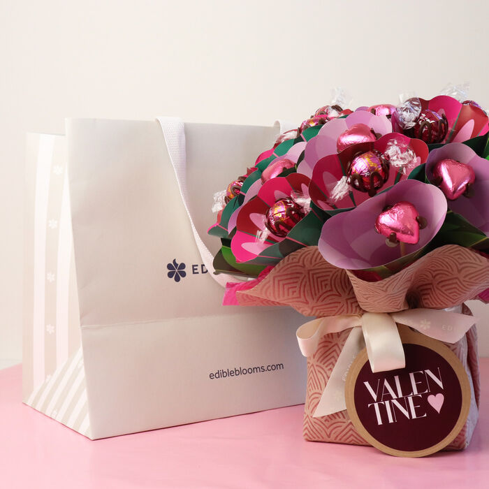 Enjoy the latest Lindt Flavour - Raspberry, combined with creamy milk chocolate hearts. 48 Chocolates are beautifully wrapped in a mix of dusty pink, mauve & taupe placed within a carry bag.