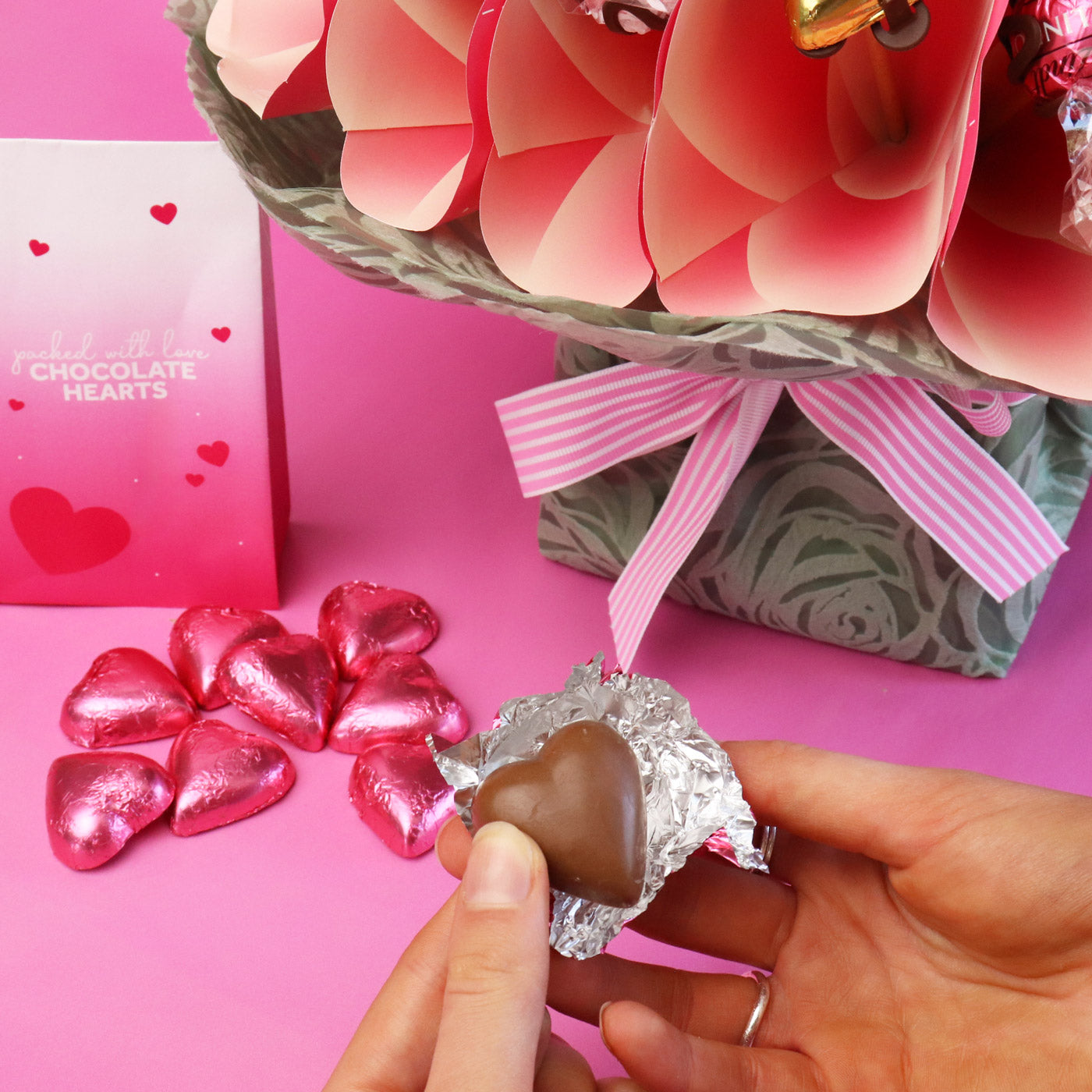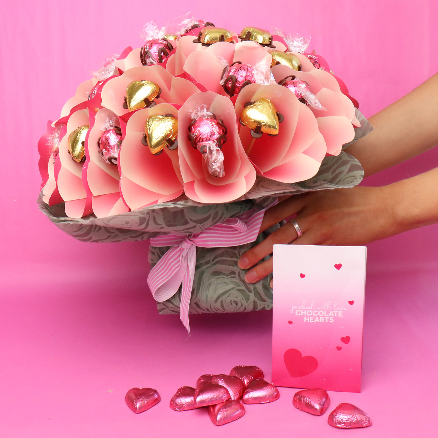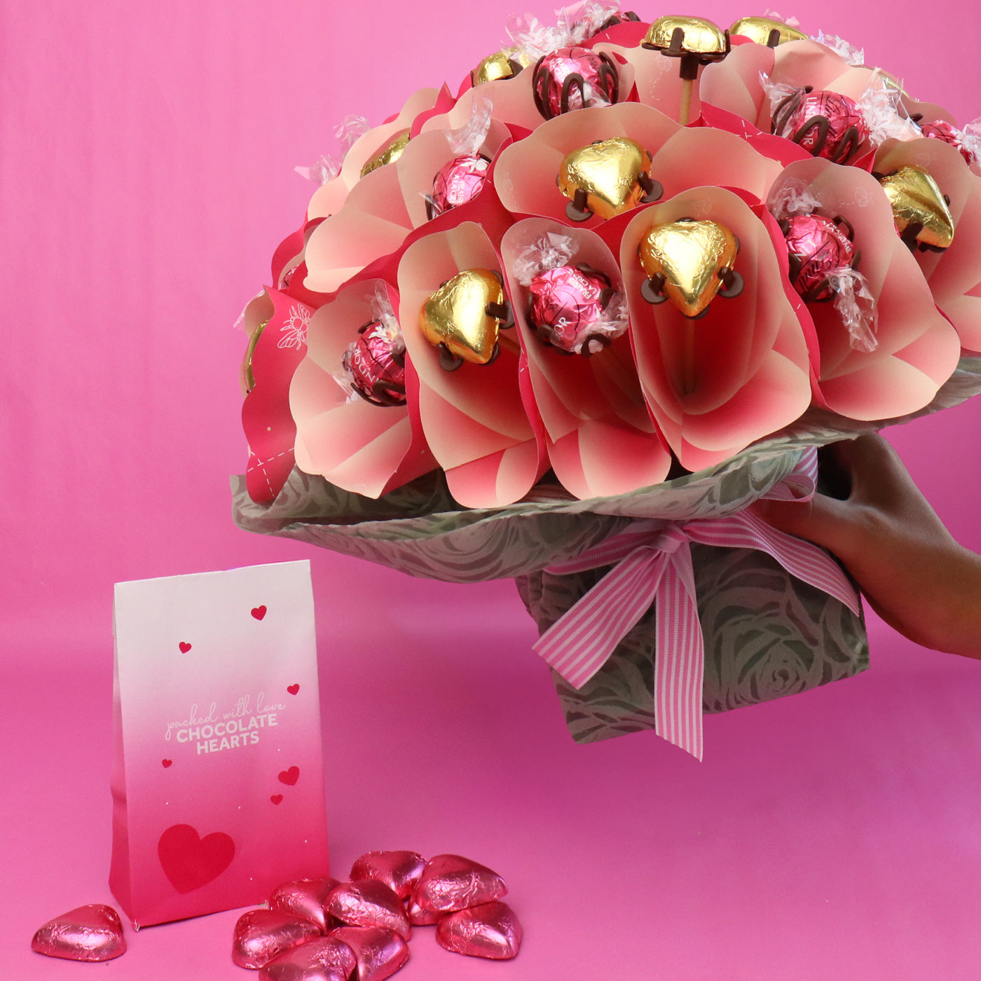 Crafted to deliver love. The perfect pairing of Strawberry and Cream Lindt and creamy milk chocolate hearts. All packaged beautifully wrapped in our new tulip cones and green wrapped placed within a carry bag. Valentine Flowers & Chocolate Hearts