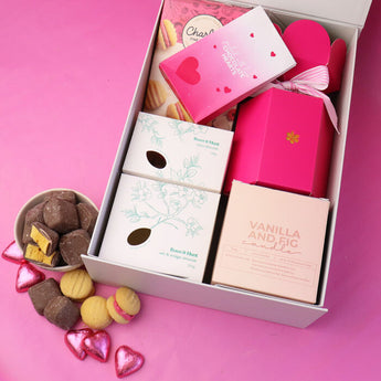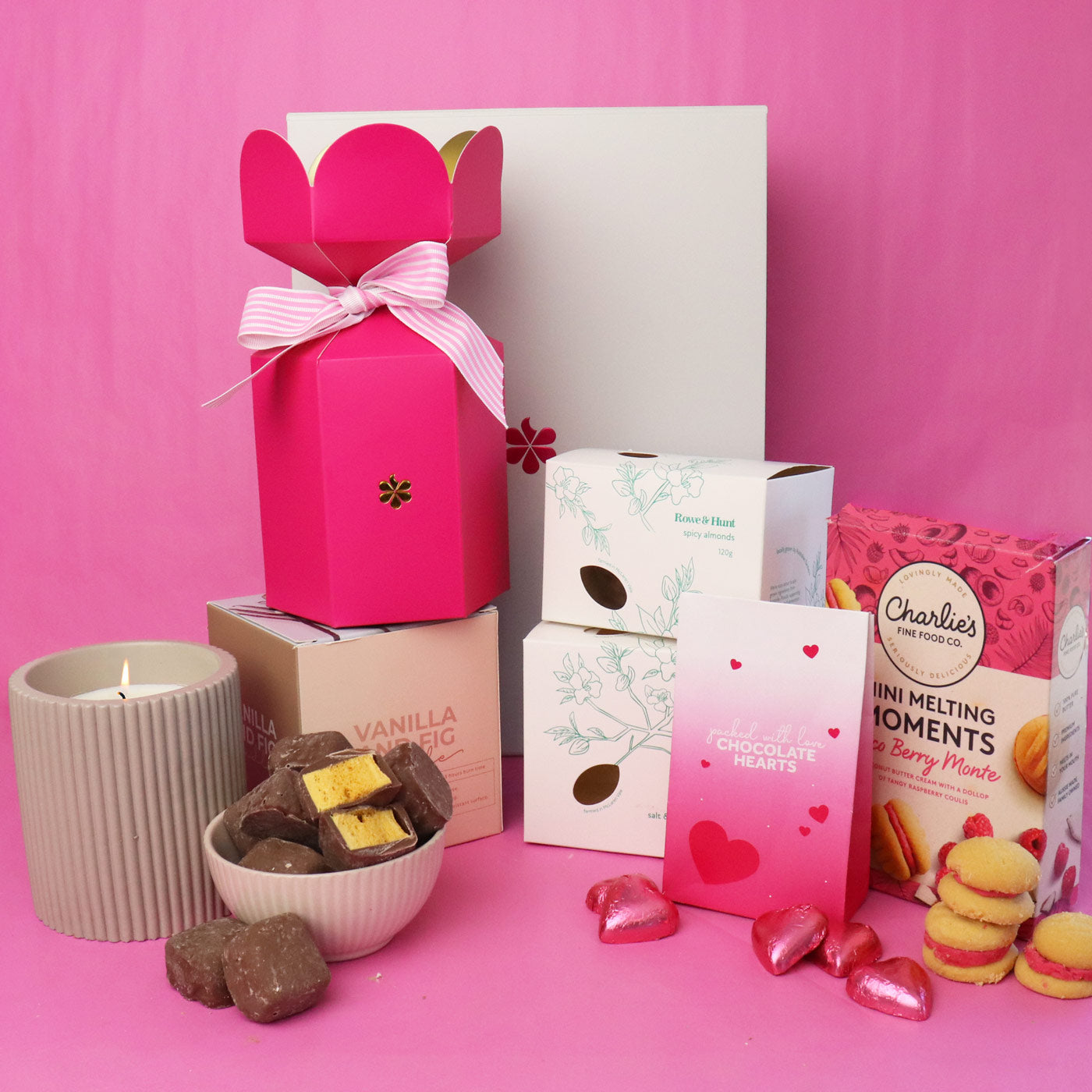 Our Valentine Gourmet Hamper is brimming with a loved-up assortment of treats, just waiting to be delivered. From raspberry melting moments, to the sweetest of chocolate coated honeycomb and a fragrant candle to set the mood.