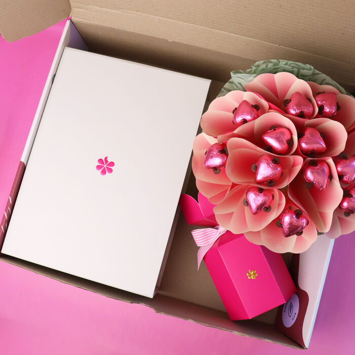 The large version of our Valentine Gourmet Hamper has a few extra special Valentine's treats, including the prettiest of mini chocolate flower bouquets and a mini bottle of sparkling wine.