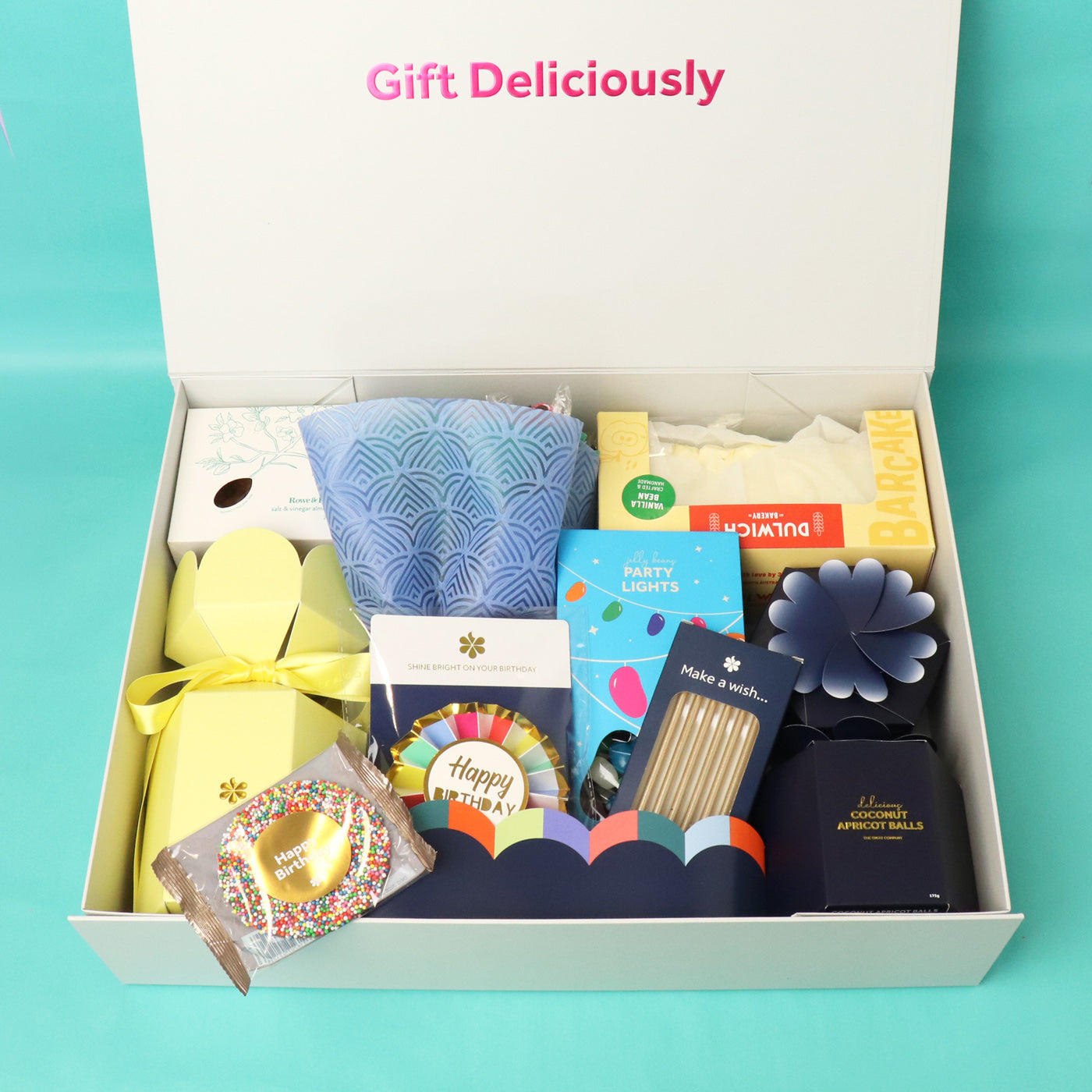 A birthday gift hamper, filled with vibrant rainbow Lindt posy and a selection of gourmet treats from Rocky Road, coconut balls, and honeycomb plus more... Let's hope they know how to share.