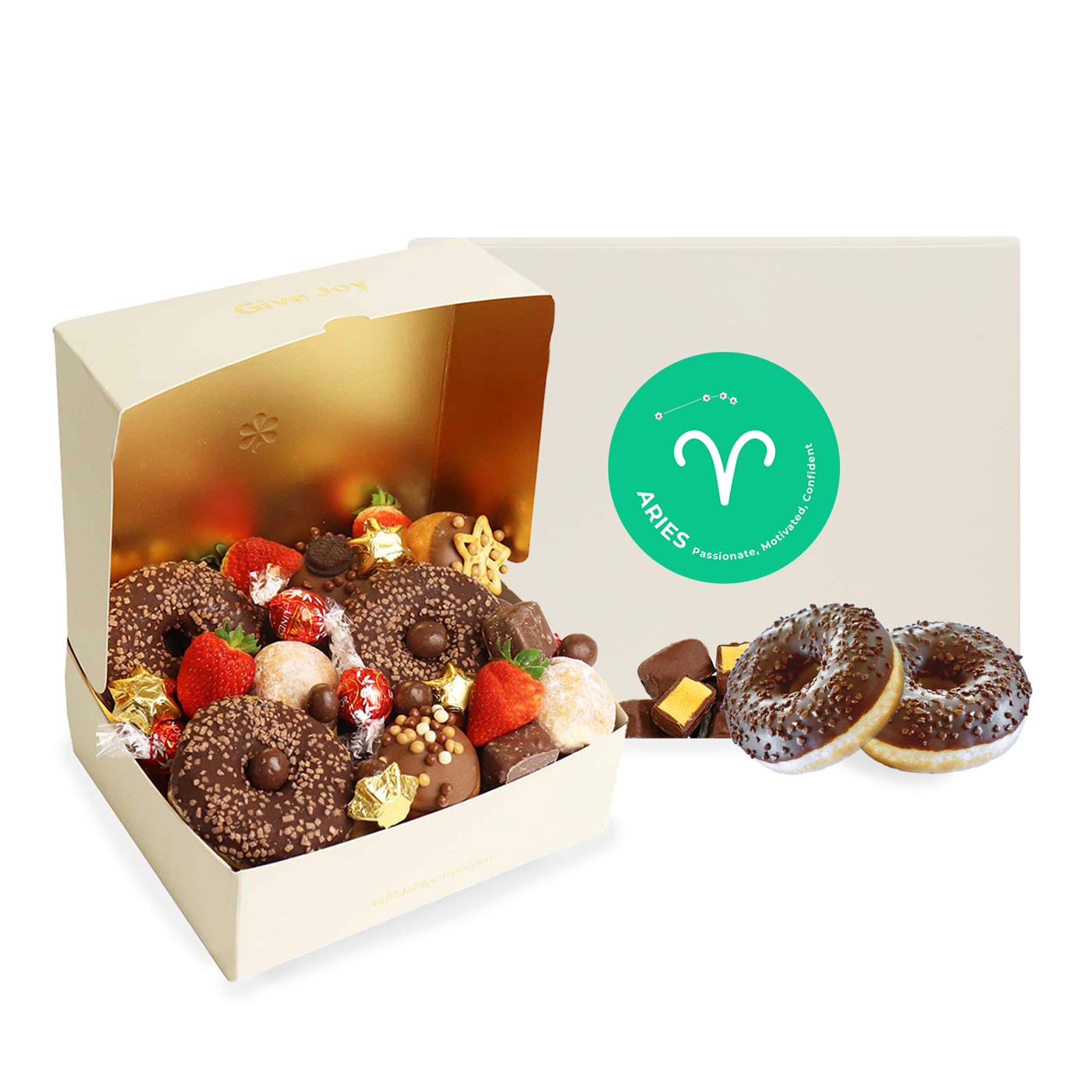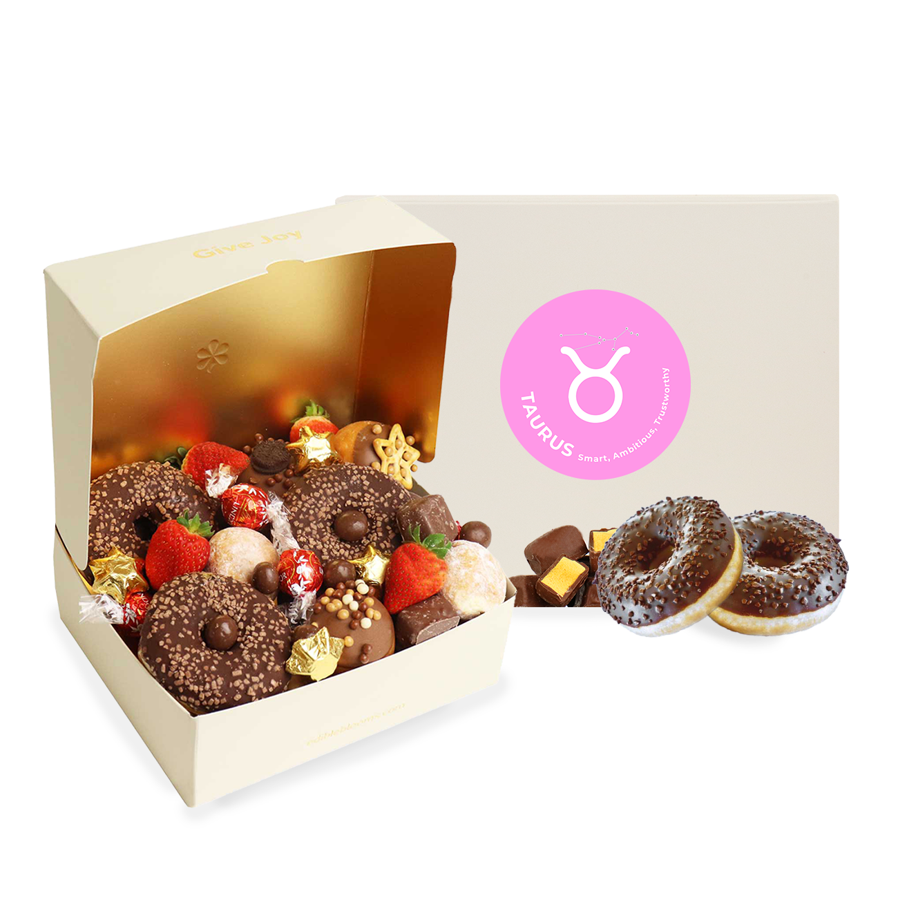 An open dessert box revealing an assortment of donuts, strawberries, and other treats with a focus on freshness and variety. The box is branded with a 'ZODIAC' logo and has ' taurus ' written on it, indicating a themed gift box for the Gemini zodiac sign.