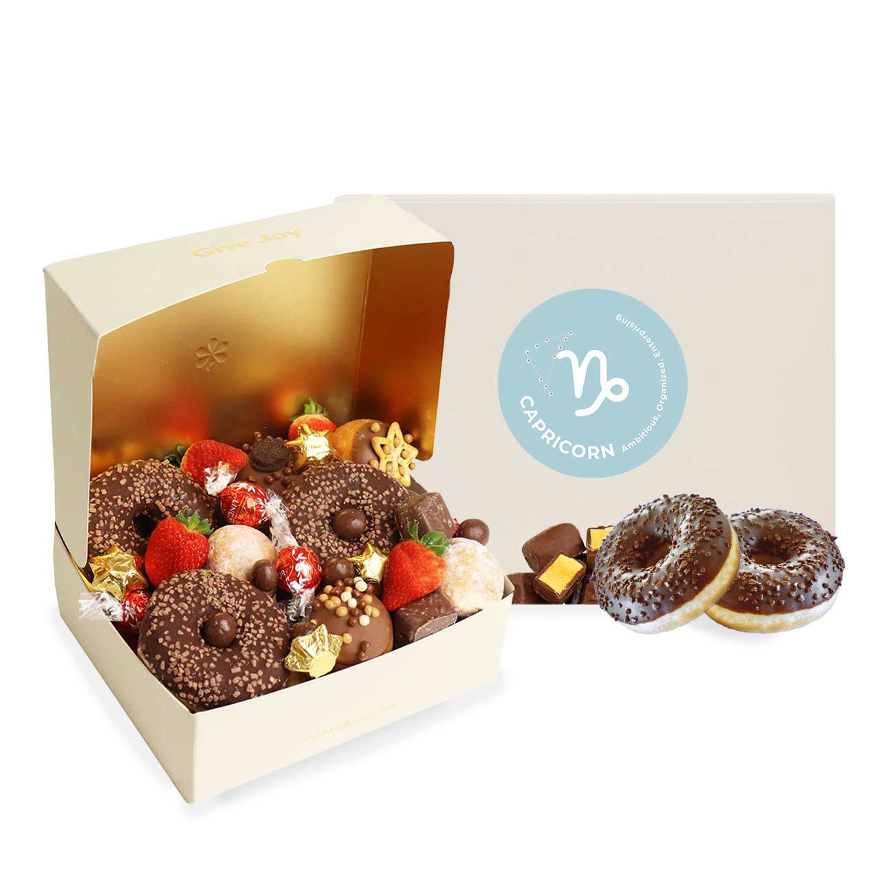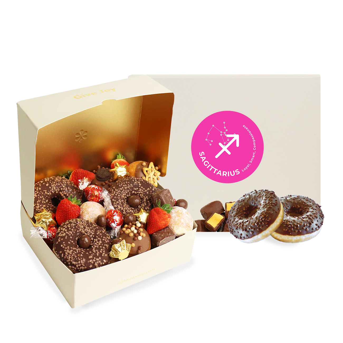 An open dessert box revealing an assortment of donuts, strawberries, and other treats with a focus on freshness and variety. The box is branded with a 'ZODIAC' logo and has ' Sagitarius ' written on it, indicating a themed gift box for the Gemini zodiac sign.