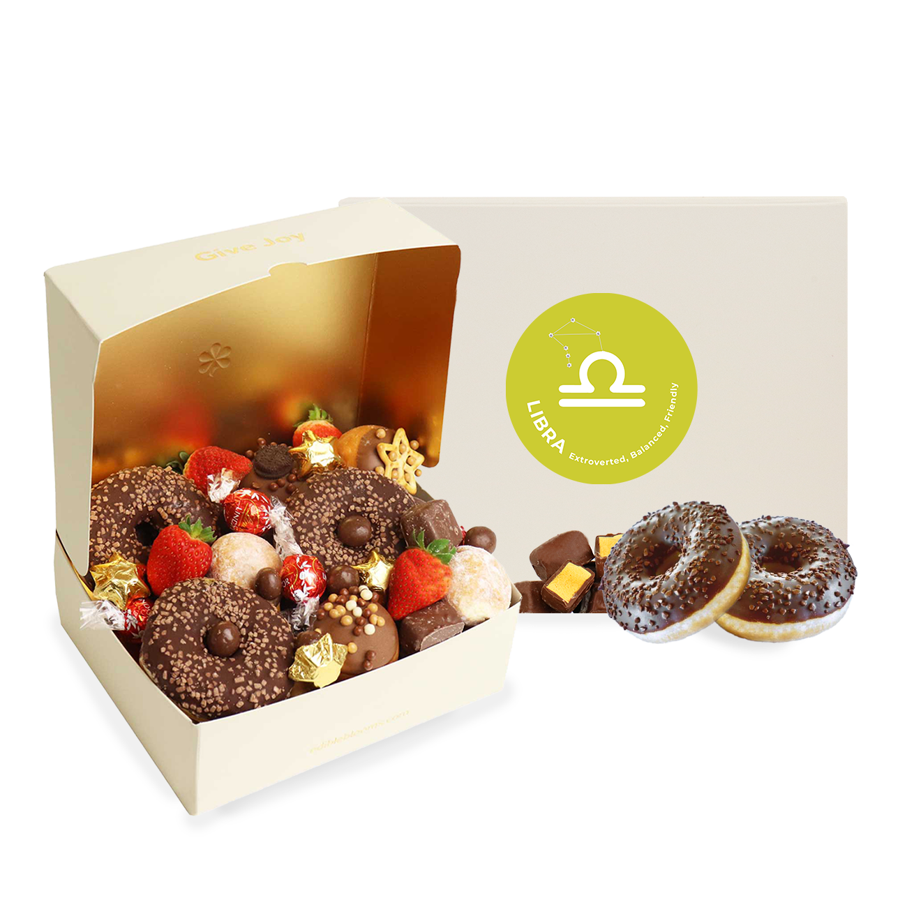 An open dessert box revealing an assortment of donuts, strawberries, and other treats with a focus on freshness and variety. The box is branded with a 'ZODIAC' logo and has ' Libra ' written on it, indicating a themed gift box for the Gemini zodiac sign.