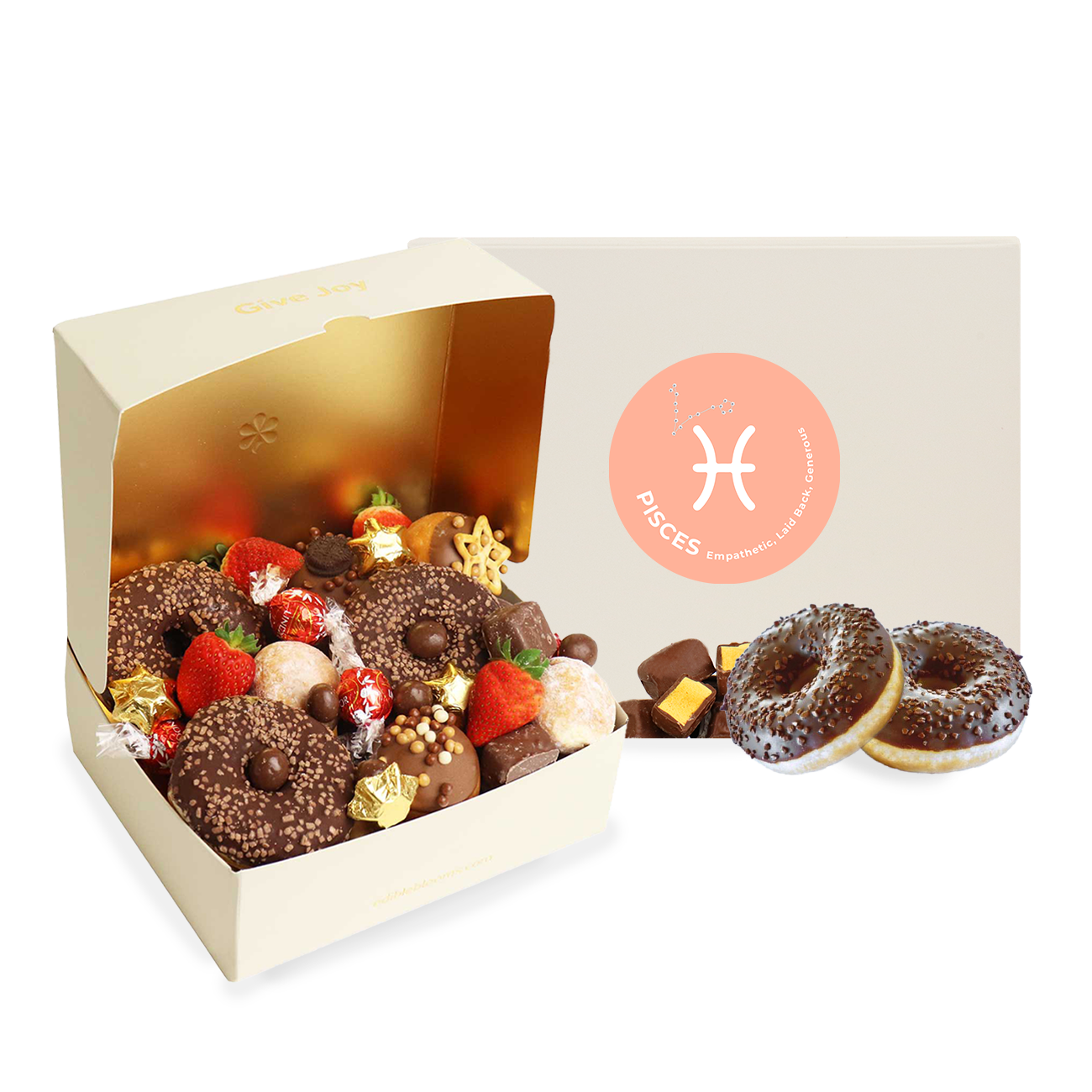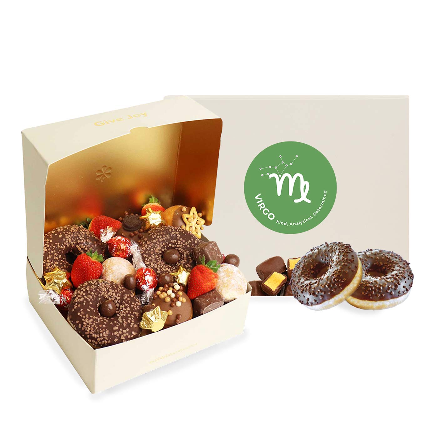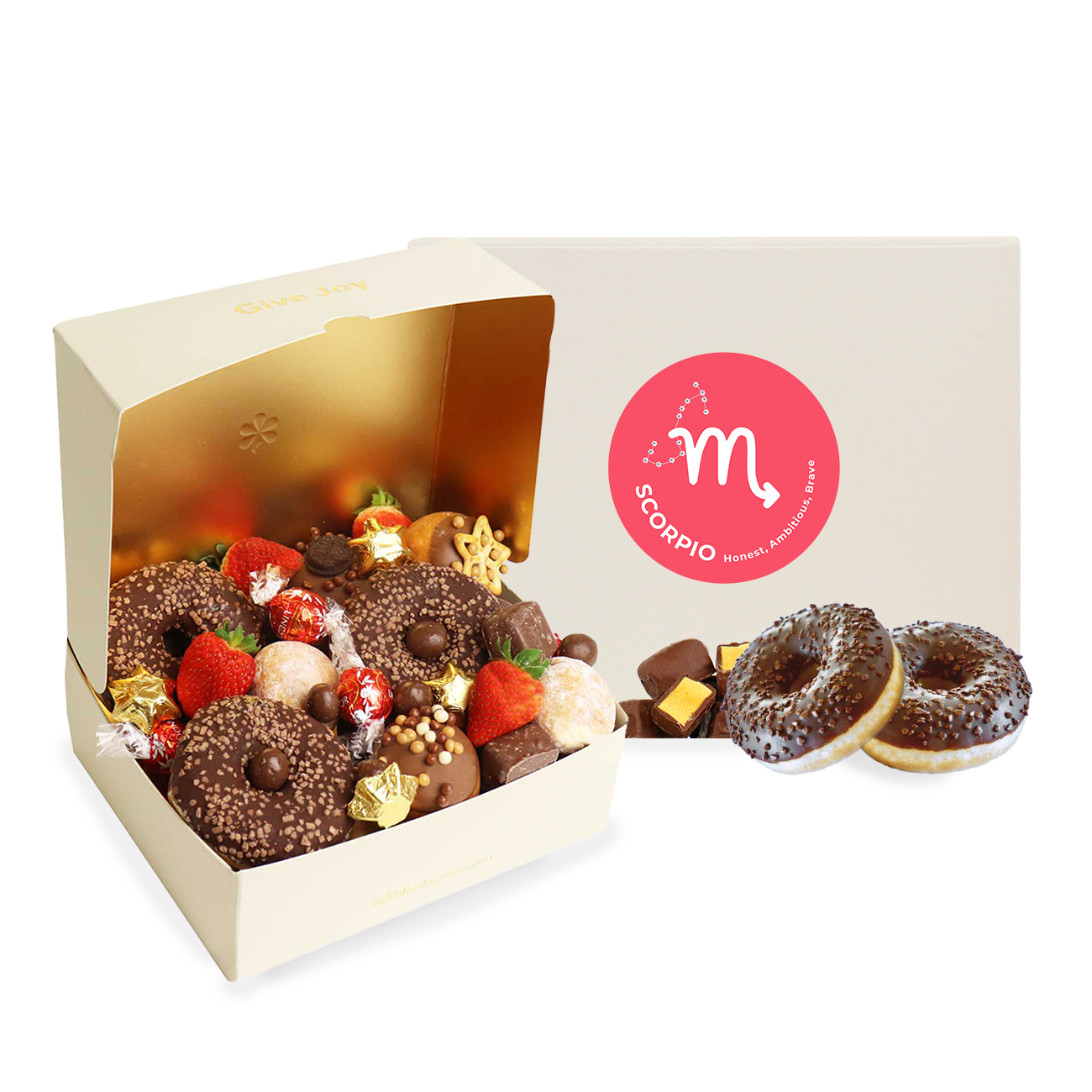 An open dessert box revealing an assortment of donuts, strawberries, and other treats with a focus on freshness and variety. The box is branded with a 'ZODIAC' logo and has ' Scorpio ' written on it, indicating a themed gift box for the Gemini zodiac sign.